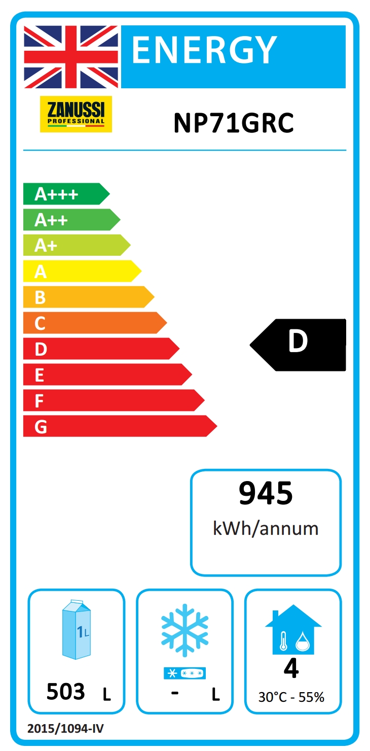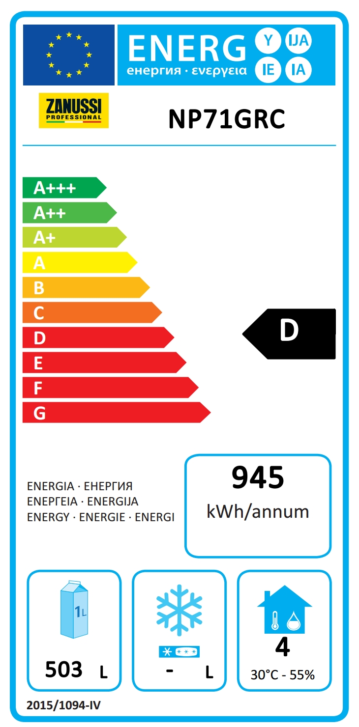Armoire certifiée classe A dans les conditions de travail sévères (40 ° C-40% d'humidité) sur la base de la directive sur l'écoconception européenne. L'économie annuelle potentielle estimée en remplaçant une armoire en classe A avec une armoire en classe G de volume équivalent, est égal à 300 € pour chaque réfrigérateur remplacé (en tenant compte d'un coût énergétique de 0,21 € / kWh et un volume net de 503L) .